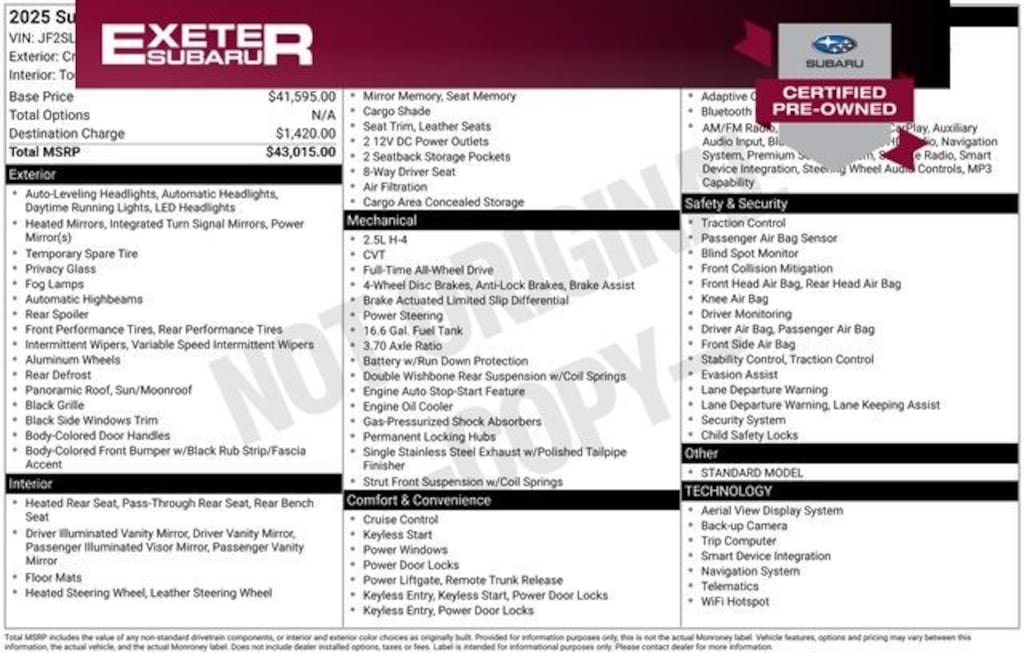 Active Cruise Control, Alloy wheels, AM/FM radio: SiriusXM with 360L, Auto High-beam Headlights, Exterior Parking Camera Rear, Front dual zone A/C, Heated & Ventilated Front Bucket Seats, Heated door mirrors, Heated rear seats, Heated steering wheel, Illuminated entry, Leather steering wheel, Navigation System, Perforated Leather-Trimmed Upholstery, Power door mirrors, Power Liftgate, Power moonroof: Panoramic, Radio: Subaru 11.6" Multimedia Navigation System, Telescoping steering wheel, Turn signal indicator mirrors.