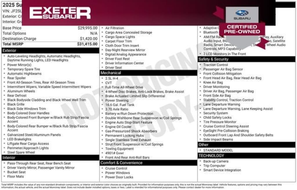Air Conditioning, Alloy wheels, Auto High-beam Headlights, Automatic temperature control, Brake assist, Electronic Stability Control, Exterior Parking Camera Rear, Four wheel independent suspension, Front Bucket Seats, Fully automatic headlights, Hexagonal Patterned Cloth Upholstery, Illuminated entry, Outside temperature display, Power door mirrors, Radio: Subaru Dual 7.0" Multimedia System, Security system, Speed control.