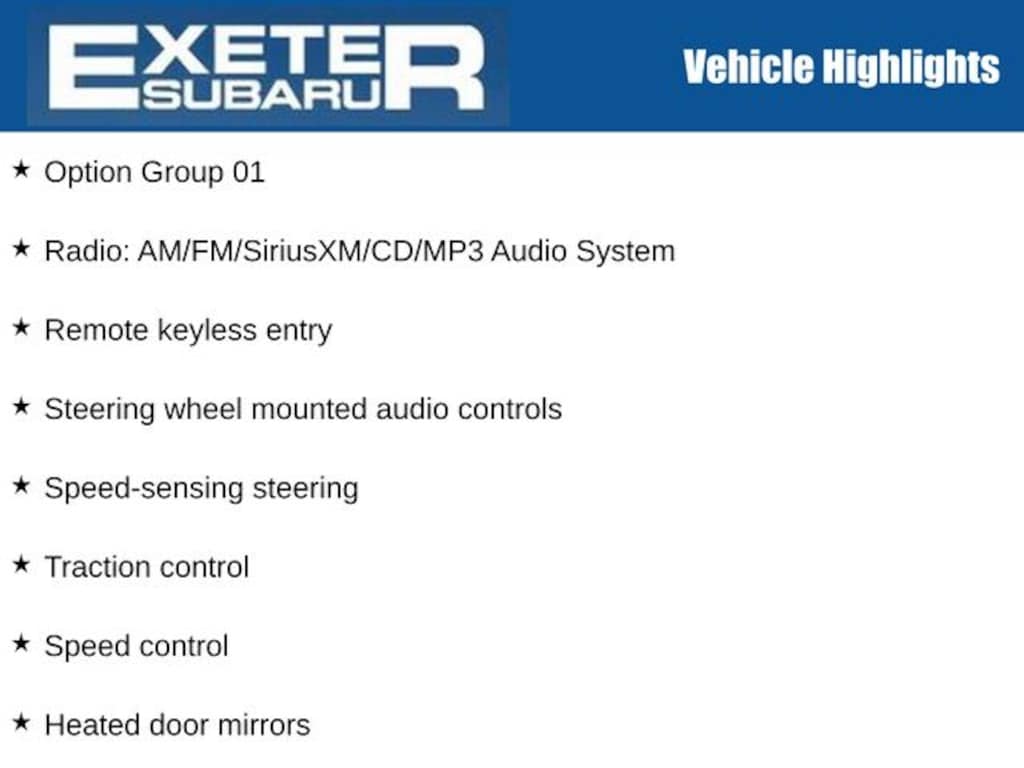Heated door mirrors, Heated Front Bucket Seats, Illuminated entry, Option Group 01, Premium Cloth Seating Surfaces, Radio: AM/FM/SiriusXM/CD/MP3 Audio System, Remote keyless entry, Speed control, Speed-sensing steering, Steering wheel mounted audio controls, Telescoping steering wheel, Traction control.