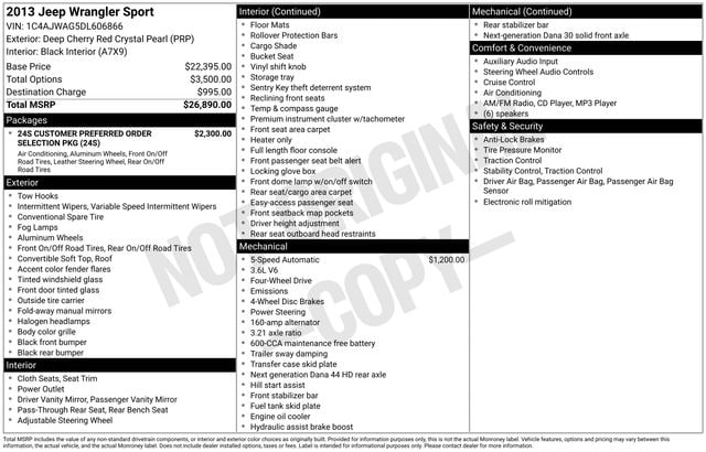 Deep Cherry Red Crystal Pearlcoat 2013 Jeep Wrangler Sport 4WD 2D Sport Utility 5-Speed Automatic 3.6L V6 24V VVT