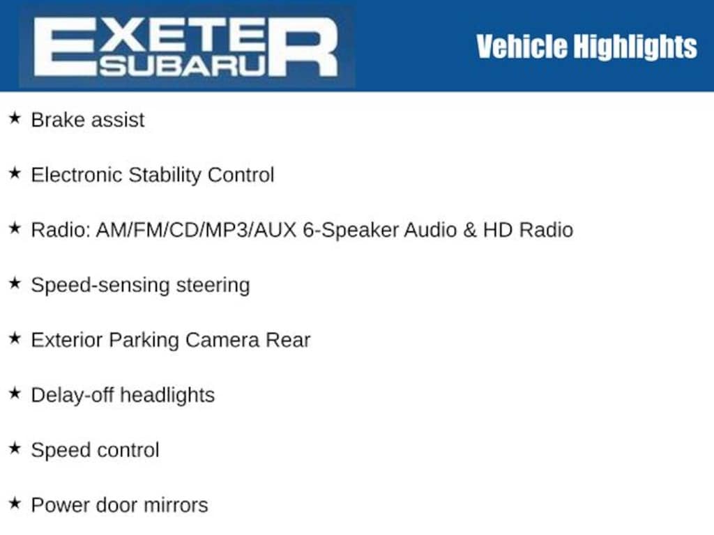 17" Alloy Wheels, Brake assist, Delay-off headlights, Electronic Stability Control, Exterior Parking Camera Rear, Front Bucket Seats, Leather Shift Knob, Outside temperature display, Power door mirrors, Radio: AM/FM/CD/MP3/AUX 6-Speaker Audio & HD Radio, Reclining Front Sport Bucket Seats, Speed control, Speed-sensing steering, Telescoping steering wheel, Turn signal indicator mirrors.