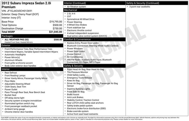 Deep Cherry Red 2012 Subaru Impreza 2.0i Premium AWD 4D Sedan CVT Lineartronic 2.0L DOHC 27/36 City/Highway MPG