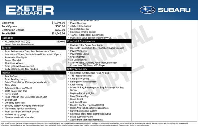 ![]() | Exeter Subaru is your best stop for New and Used vehicles. We're constantly expanding to accommodate our incoming inventory of New Vehicles. So if you don't see something on our Stratham, NH lot, ask a product specialist if we have a vehicle in stock as it may be down the road on one of our two overflow lots. We also take in trades daily and go to the auctions twice a week. If you don't see anything on our site today, check again for new additions tomorrow. Providing the best Used Subaru's and other manufacturer's vehicles to the Exeter, Somersworth, Dover, Plaistow, North Hampton, and Manchester areas. All prices are based on utilizing all available dealer discounts and financing. |