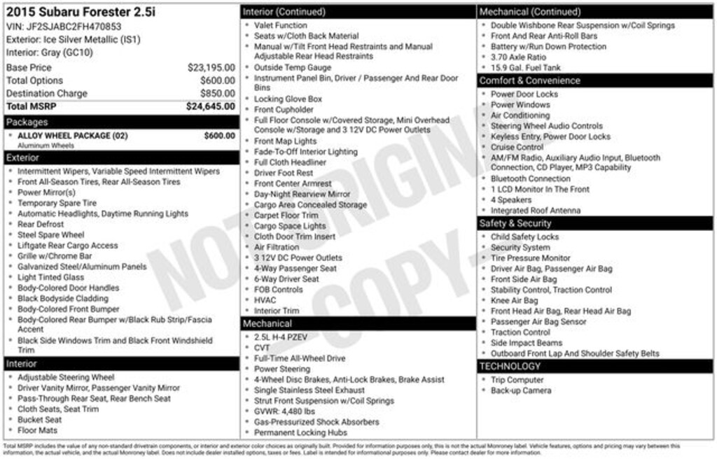 Ice Silver Metallic 2015 Subaru Forester 2.5i AWD 4D Sport Utility Lineartronic CVT 2.5L 4-Cylinder DOHC 16V VVT 24/32 City/Highway MPG