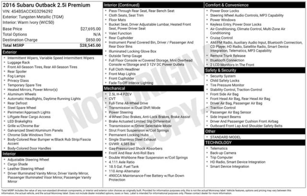 Tungsten Metallic 2016 Subaru Outback 2.5i Premium AWD 4D Sport Utility CVT Lineartronic 2.5L 4-Cylinder DOHC 16V 25/33 City/Highway MPG
