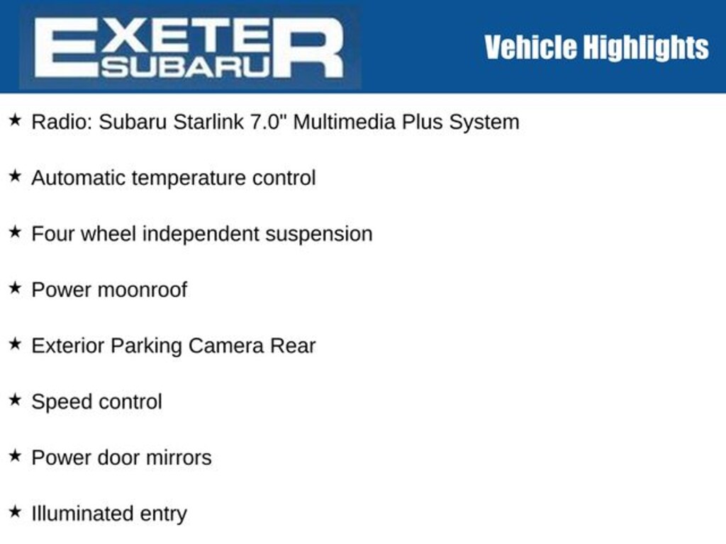 Alloy wheels, Automatic temperature control, Exterior Parking Camera Rear, Four wheel independent suspension, Front Bucket Seats, Illuminated entry, Power door mirrors, Power moonroof, Radio: Subaru Starlink 7.0" Multimedia Plus System, Speed control, Telescoping steering wheel.