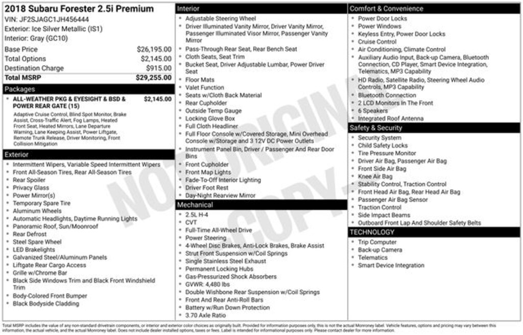 Ice Silver Metallic 2018 Subaru Forester 2.5i Premium AWD 4D Sport Utility Lineartronic CVT 2.5L 4-Cylinder DOHC 16V VVT 26/32 City/Highway MPG
