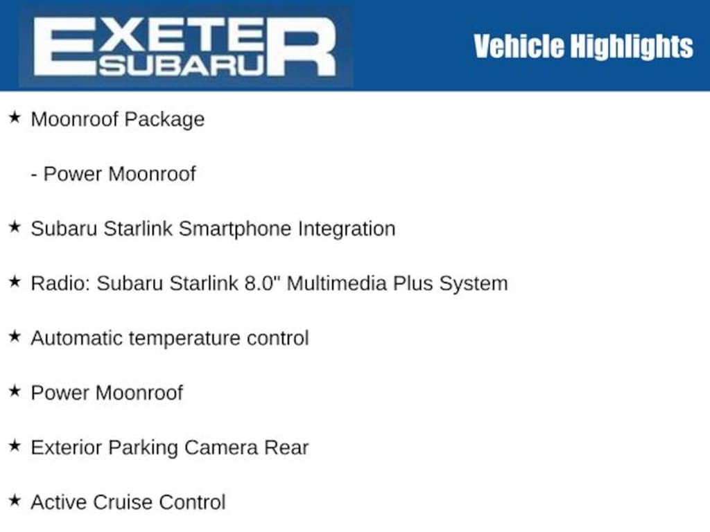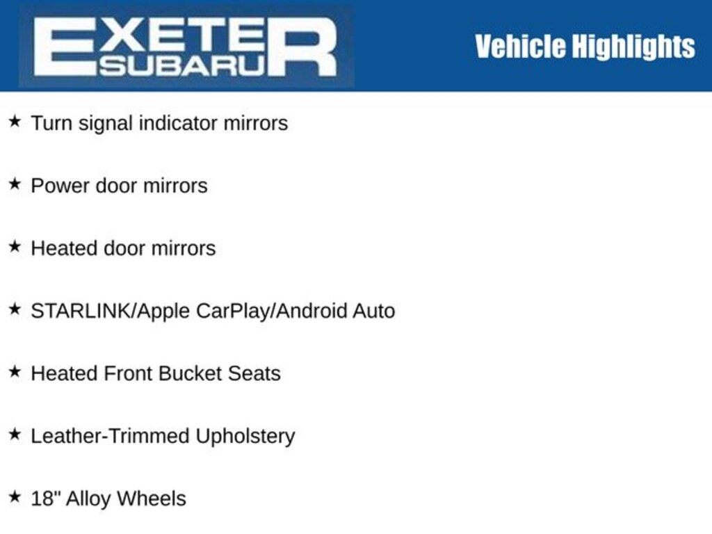 18" Alloy Wheels, Active Cruise Control, Automatic temperature control, Exterior Parking Camera Rear, Heated door mirrors, Heated Front Bucket Seats, Leather-Trimmed Upholstery, Moonroof Package, Power door mirrors, Power Moonroof, Radio: Subaru Starlink 8.0" Multimedia Plus System, STARLINK/Apple CarPlay/Android Auto, Subaru Starlink Smartphone Integration, Turn signal indicator mirrors.