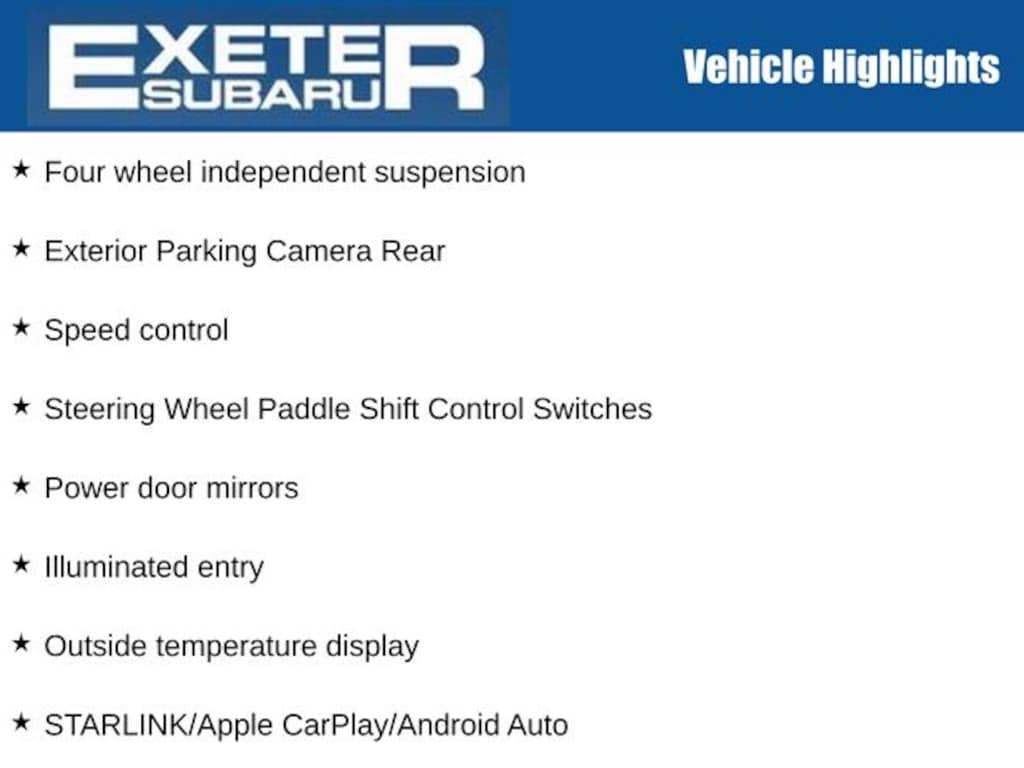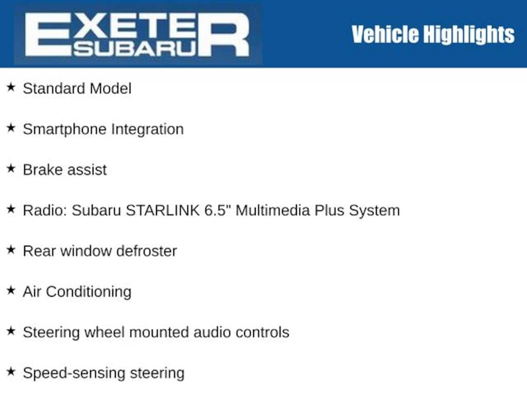 17" Alloy Wheels, Air Conditioning, Brake assist, Exterior Parking Camera Rear, Four wheel independent suspension, Front Bucket Seats, Illuminated entry, Outside temperature display, Power door mirrors, Radio: Subaru STARLINK 6.5" Multimedia Plus System, Rear window defroster, Smartphone Integration, Speed control, Speed-sensing steering, Standard Model, STARLINK/Apple CarPlay/Android Auto, Steering wheel mounted audio controls, Steering Wheel Paddle Shift Control Switches.