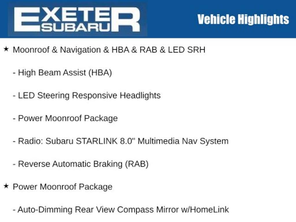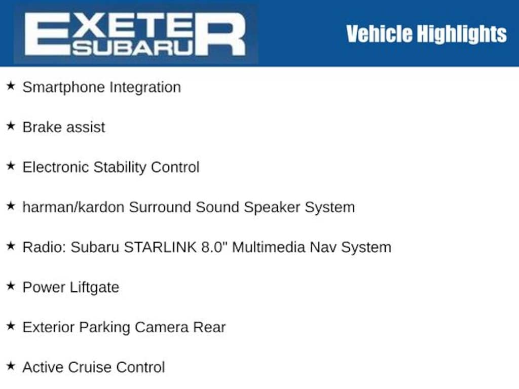 18" Alloy Wheels, Active Cruise Control, Auto-Dimming Rear View Compass Mirror w/HomeLink, Brake assist, Electronic Stability Control, Exterior Parking Camera Rear, harman/kardon Surround Sound Speaker System, Heated door mirrors, Heated Front Bucket Seats, High Beam Assist (HBA), LED Steering Responsive Headlights, Moonroof & Navigation & HBA & RAB & LED SRH, Power Liftgate, Power Moonroof Package, Radio: Subaru STARLINK 8.0" Multimedia Nav System, Reverse Automatic Braking (RAB), Smartphone Integration, STARLINK/Apple CarPlay/Android Auto, Steering Wheel Paddle Shift Control Switches, Turn signal indicator mirrors.