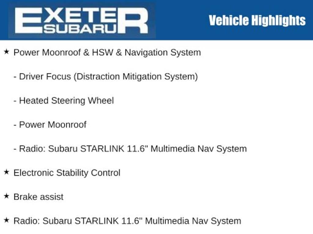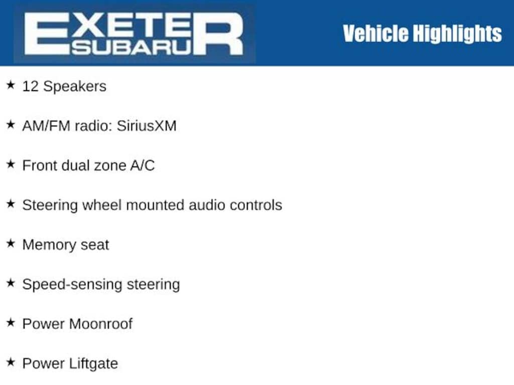 12 Speakers, Active Cruise Control, AM/FM radio: SiriusXM, Auto High-beam Headlights, Auto-dimming Rear-View mirror, Brake assist, Driver Focus (Distraction Mitigation System), Electronic Stability Control, Exterior Parking Camera Rear, Front dual zone A/C, Front fog lights, Heated Front Bucket Seats w/Memory, Heated front seats, Heated rear seats, Heated Steering Wheel, Memory seat, Perforated Leather-Trimmed Upholstery, Power Liftgate, Power Moonroof, Power Moonroof & HSW & Navigation System, Radio: Subaru STARLINK 11.6" Multimedia Nav System, Speed-sensing steering, STARLINK/Apple CarPlay/Android Auto, Steering wheel mounted audio controls, Telescoping steering wheel, Turn signal indicator mirrors.