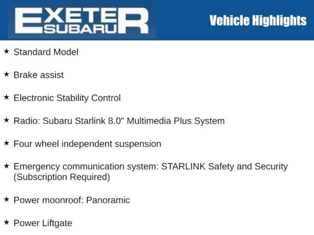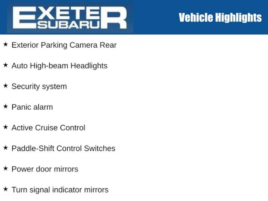 Active Cruise Control, Alloy wheels, Auto High-beam Headlights, Brake assist, Electronic Stability Control, Emergency communication system: STARLINK Safety and Security (Subscription Required), Exterior Parking Camera Rear, Four wheel independent suspension, Heated door mirrors, Heated Front Bucket Seats, Illuminated entry, Paddle-Shift Control Switches, Panic alarm, Power door mirrors, Power Liftgate, Power moonroof: Panoramic, Radio: Subaru Starlink 8.0" Multimedia Plus System, Security system, Standard Model, STARLINK/Apple CarPlay/Android Auto, Tachometer, Turn signal indicator mirrors.