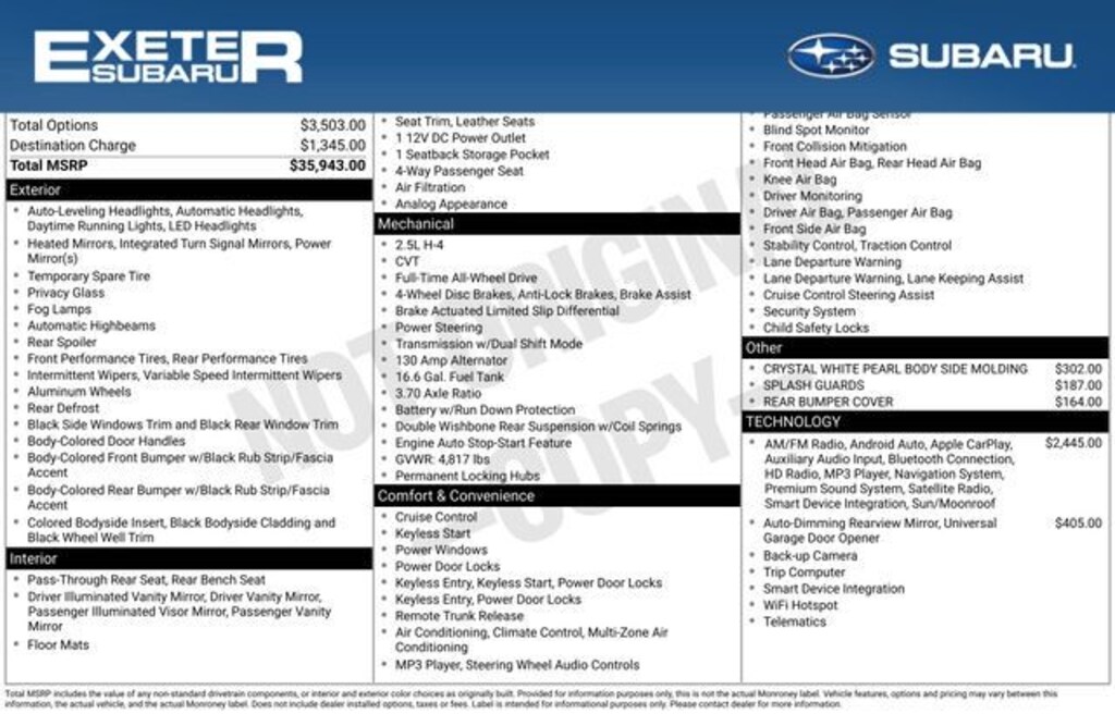 ![]() | Exeter Subaru is your best stop for New and Used vehicles. We're constantly expanding to accommodate our incoming inventory of New Vehicles. So if you don't see something on our Stratham, NH lot, ask a product specialist if we have a vehicle in stock as it may be down the road on one of our two overflow lots. We also take in trades daily and go to the auctions twice a week. If you don't see anything on our site today, check again for new additions tomorrow. Providing the best Used Subaru's and other manufacturer's vehicles to the Exeter, Somersworth, Dover, Plaistow, North Hampton, and Manchester areas. All prices are based on utilizing all available dealer discounts and financing. |