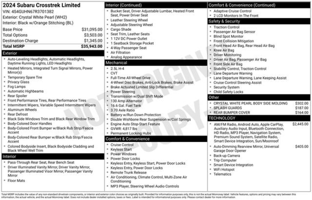 Crystal White Pearl 2024 Subaru Crosstrek Limited AWD 4D Sport Utility Lineartronic CVT 2.5L 4-Cylinder DOHC 16V 26/33 City/Highway MPG