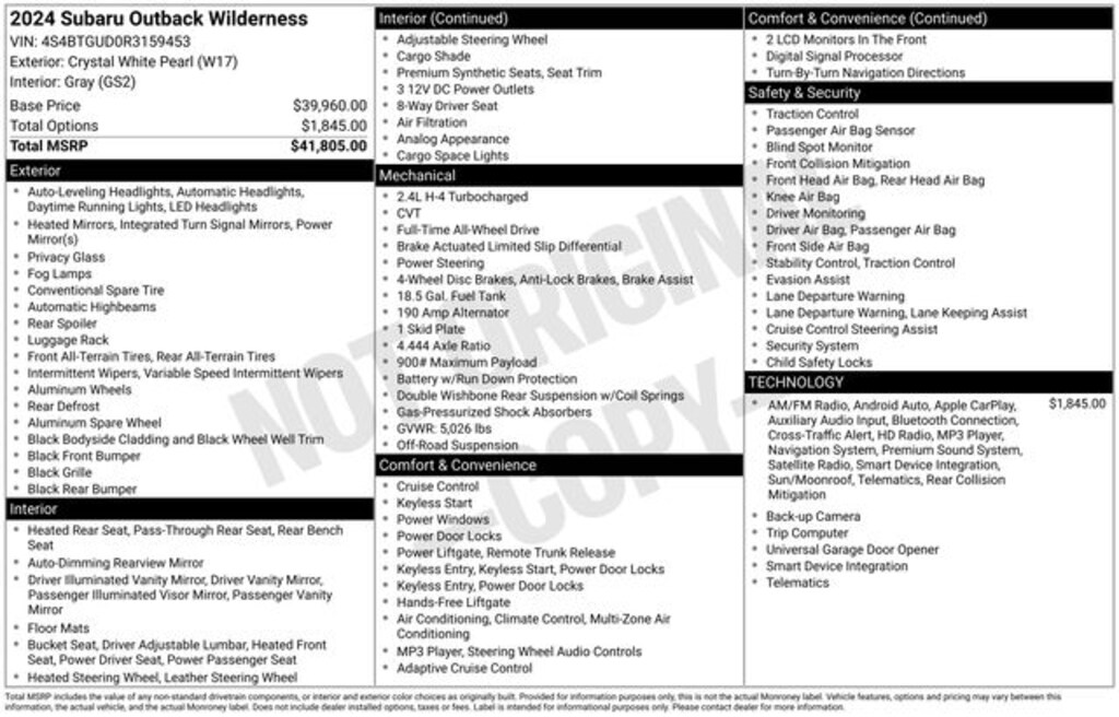 Crystal White Pearl 2024 Subaru Outback Wilderness AWD 4D Sport Utility CVT Lineartronic 2.4L DOHC 21/26 City/Highway MPG