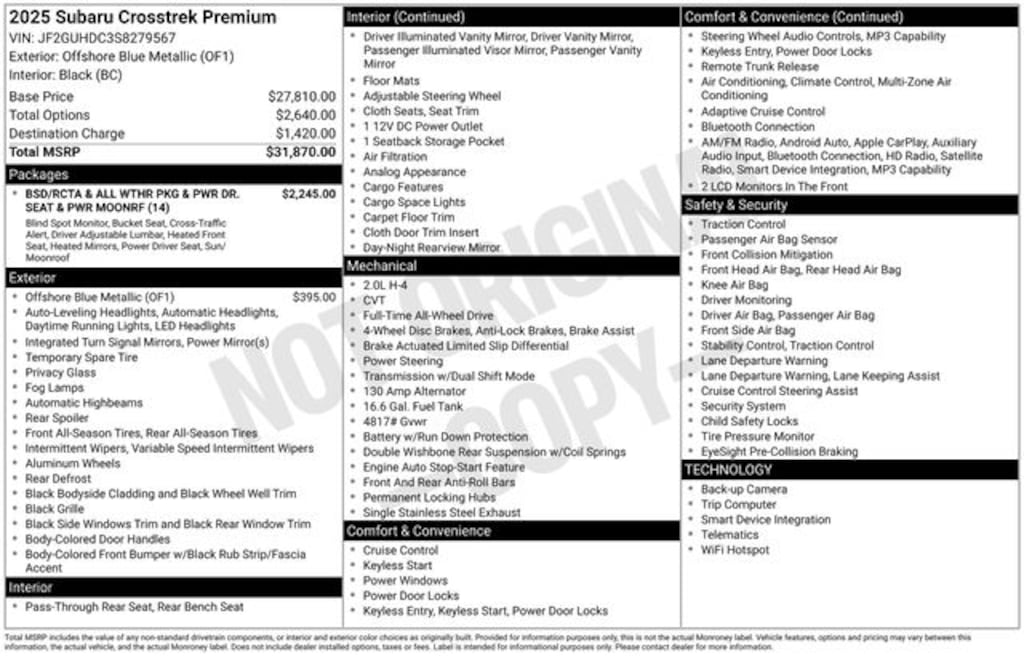 Blue Metallic 2025 Subaru Crosstrek Premium AWD 4D Sport Utility Lineartronic CVT 2.5L 4-Cylinder DOHC 16V 27/33 City/Highway MPG