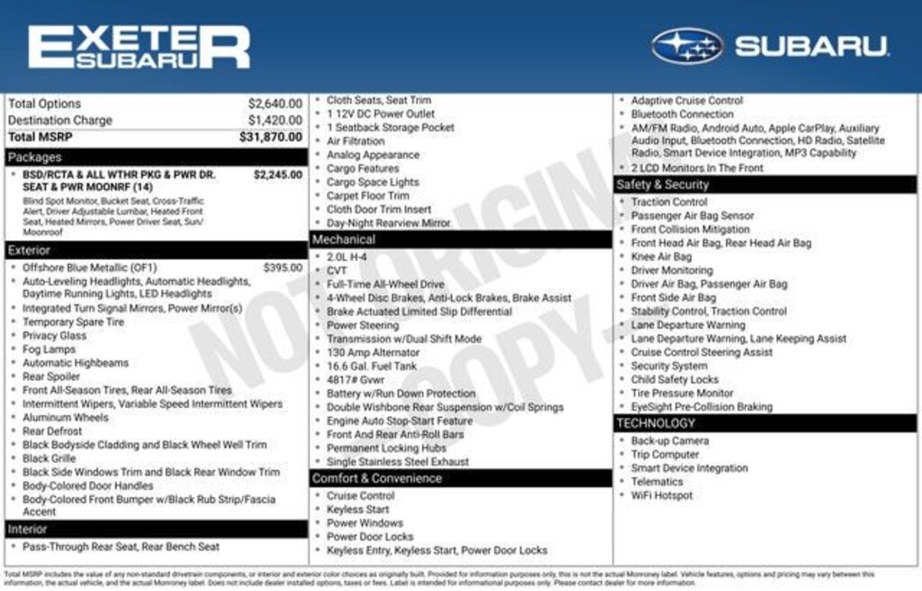 ![]() | Exeter Subaru is your best stop for New and Used vehicles. We're constantly expanding to accommodate our incoming inventory of New Vehicles. So if you don't see something on our Stratham, NH lot, ask a product specialist if we have a vehicle in stock as it may be down the road on one of our two overflow lots. We also take in trades daily and go to the auctions twice a week. If you don't see anything on our site today, check again for new additions tomorrow. Providing the best Used Subaru's and other manufacturer's vehicles to the Exeter, Somersworth, Dover, Plaistow, North Hampton, and Manchester areas. All prices are based on utilizing all available dealer discounts and financing. |