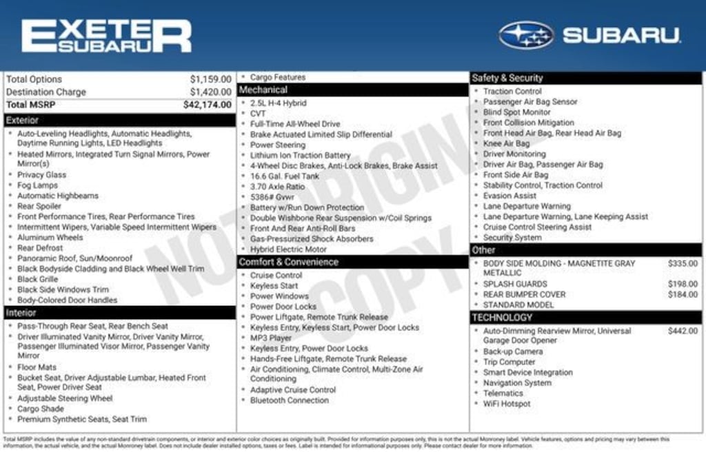 I bought this recently from Granite Subaru in Hudson, NH and I am so pleased I did. The Premium trim comes with great features AWD, Multiple cameras for safety, lane departure alert, 12" Media Screen with CarPlay, Panaramic Sunroof, roof racks, and much more. The size, features and gas mileage fit my life perfectly.… - 5.0
