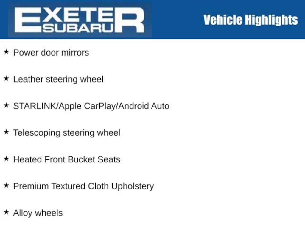 I bought this recently from Granite Subaru in Hudson, NH and I am so pleased I did. The Premium trim comes with great features AWD, Multiple cameras for safety, lane departure alert, 12" Media Screen with CarPlay, Panaramic Sunroof, roof racks, and much more. The size, features and gas mileage fit my life perfectly.… - 5.0