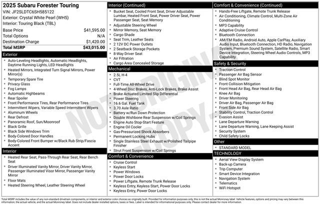 Certified. Crystal White Pearl 2025 Subaru Forester Touring AWD 4D Sport Utility Lineartronic CVT 2.5L 4-Cylinder DOHC 16V 25/32 City/Highway MPG
