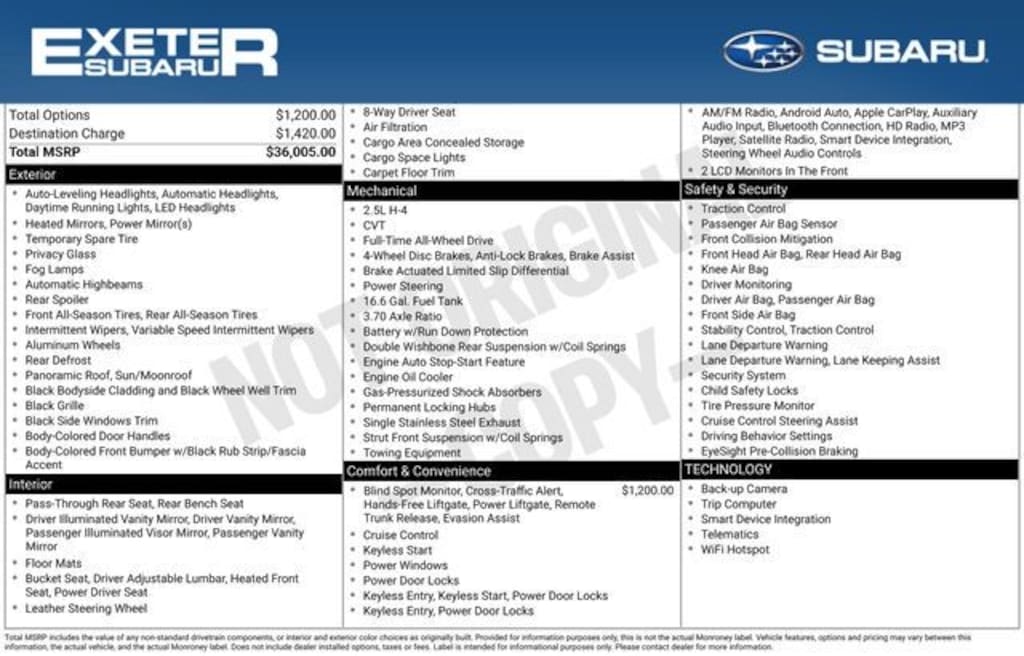 I bought this recently from Granite Subaru in Hudson, NH and I am so pleased I did. The Premium trim comes with great features AWD, Multiple cameras for safety, lane departure alert, 12" Media Screen with CarPlay, Panaramic Sunroof, roof racks, and much more. The size, features and gas mileage fit my life perfectly.… - 5.0